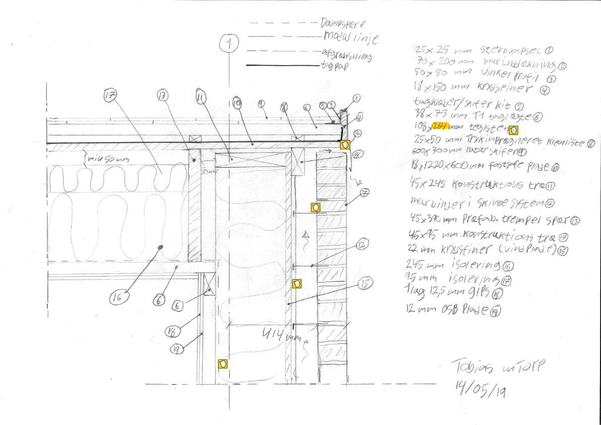I projektforslagsfasen blev der lavet funktionskravs analyser og bygningsdelsanalyser samt skitsering af de forskellige detaljer og planer.